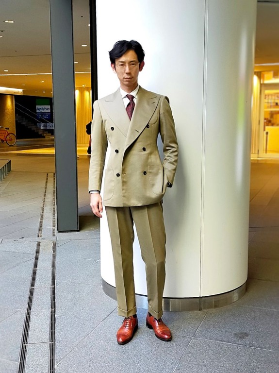 ハンドメイドオーダースーツを着用した様子を撮影しました。